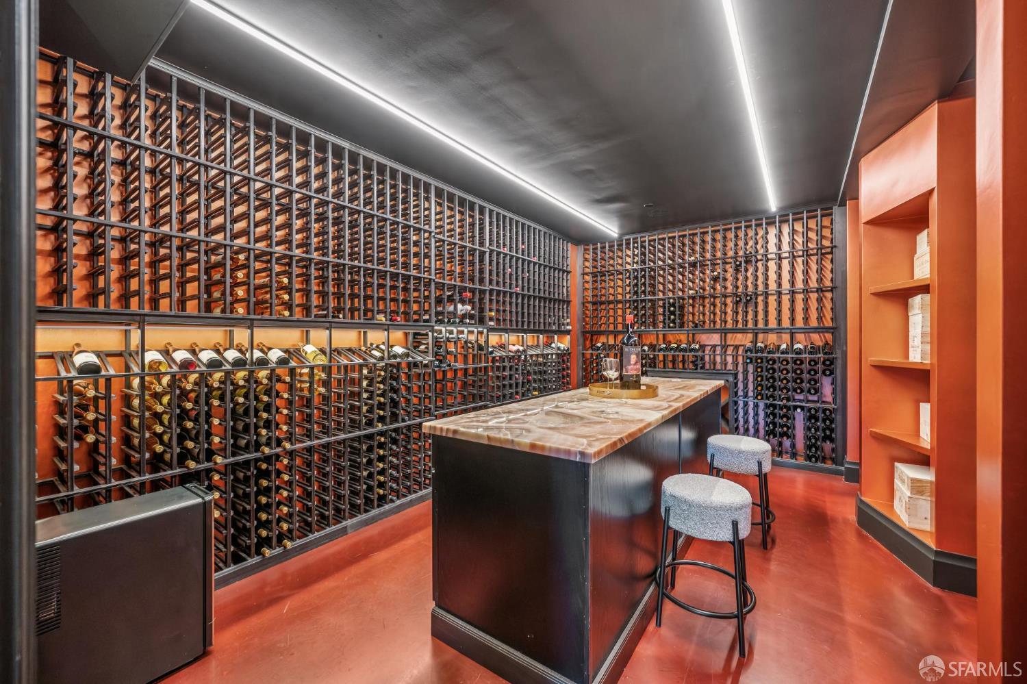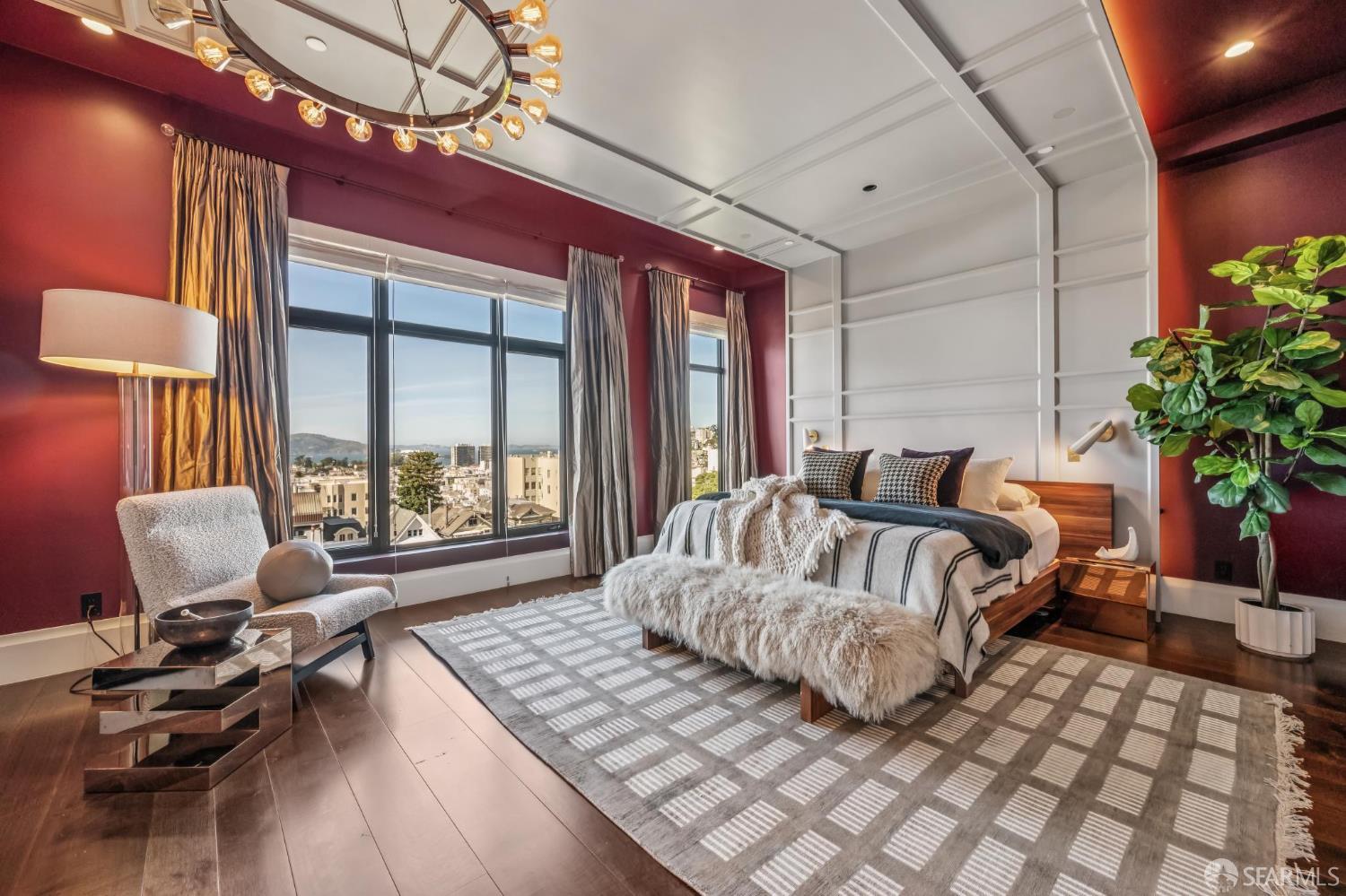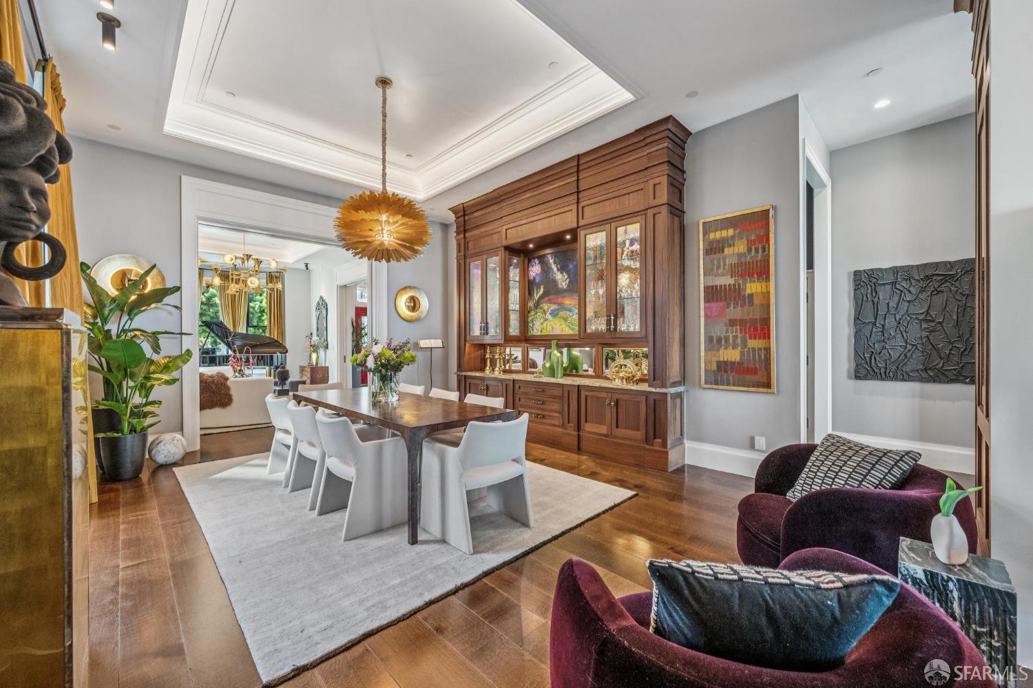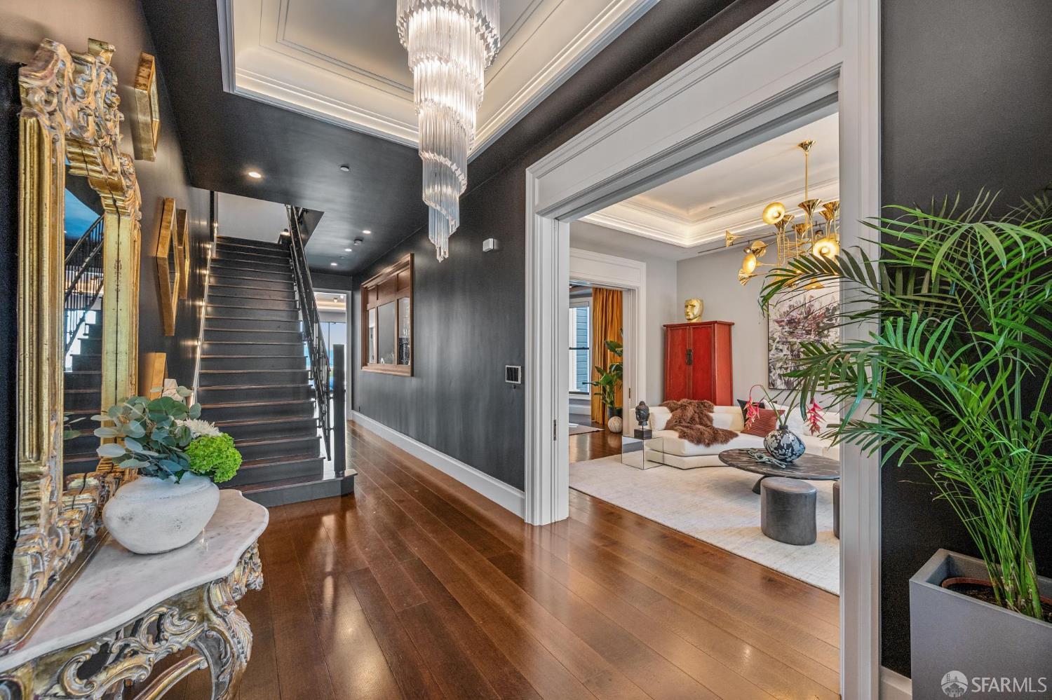 Perched on a coveted flat block inPacific Heights, this grand-scale Victorian, built in 1887 by renowned architect Charles Kenitzer, has been transformed through a meticulous five-year rebuild, marrying historic detail with modern sophistication. Spanning approximately 8,485 square feet, this 6-bedroom, 6-full-bath, 2-powder-room residence offers an extraordinary blend of timeless craftsmanship and contemporary design, complete with an elevator servicing the ground floor through the top four levels and dramatic Bay views from nearly every level. The property includes 4-car parking: a 3-car garage plus gated driveway space. Enter through original double doors into a grand parlor with soaring 13-foot ceilings, wide-plank oak floors, and a sweeping staircase. The gourmet kitchen and great room are anchored by a 9-burner Lacanche range, mahogany cabinetry, three dishwashers, and custom copper fixtures, opening to a terrace with panoramic views and a fully equipped outdoor kitchen. The primary suite offers stunning views, a fireplace, a custom dressing room, and a spa-like bath with a hammered copper tub and steam shower. Additional bedrooms feature charming details, built-ins, and direct views of city landmarks like theTransamerica Pyramid. The top floor includes a skylit bedroom, media room, and office with a private view deck. Designed for relaxation and hosting, the lower floors include a lounge with a backlit onyx bar and stage, a 3,000-bottle wine cellar, a home gym, and full spa facilities including a hot tub, sauna, cold plunge, and outdoor shower. This iconic property has also served as the backdrop for private, high-profile events, most recently hosting a Jordan Brand Super Bowl weekend experience, further underscoring its exceptional capacity for entertaining at the highest level. Located steps from Union Street, Fillmore Street, and thePresidio of San Francisco, this exceptional residence offers grand-scale living in one of the city's most sought-after and storied neighborhoods.