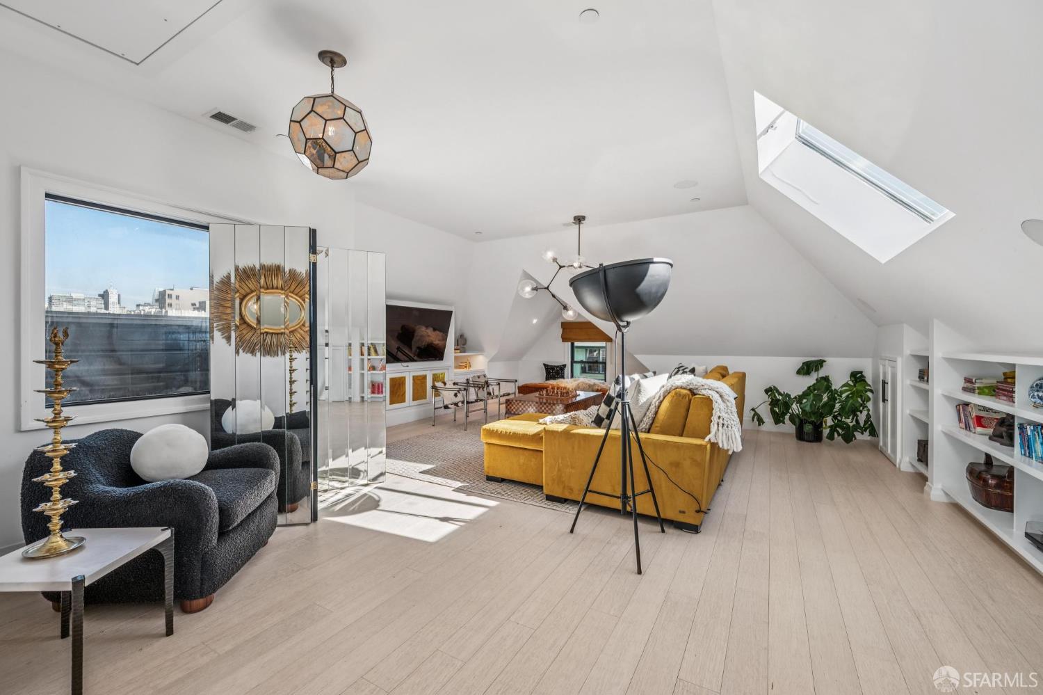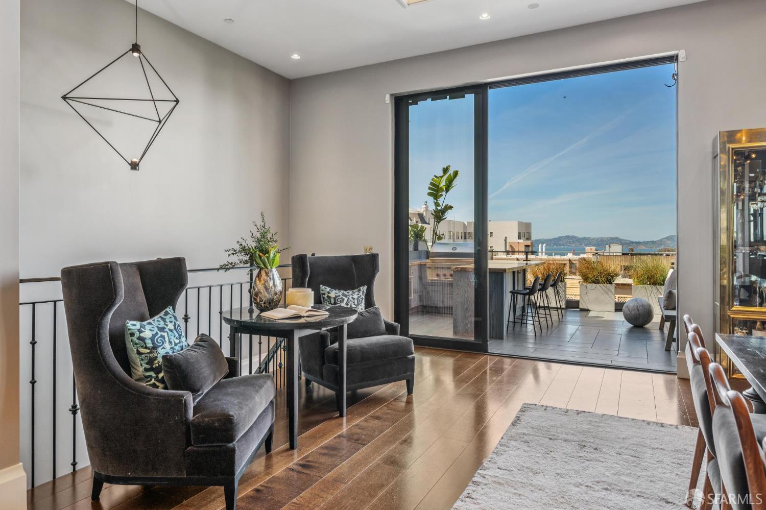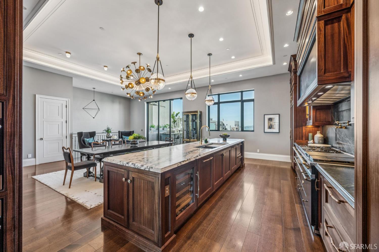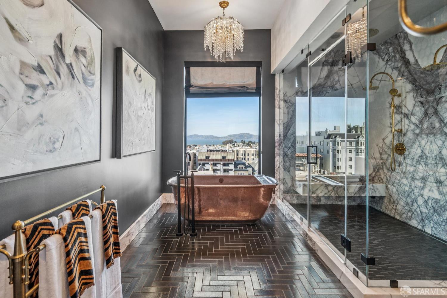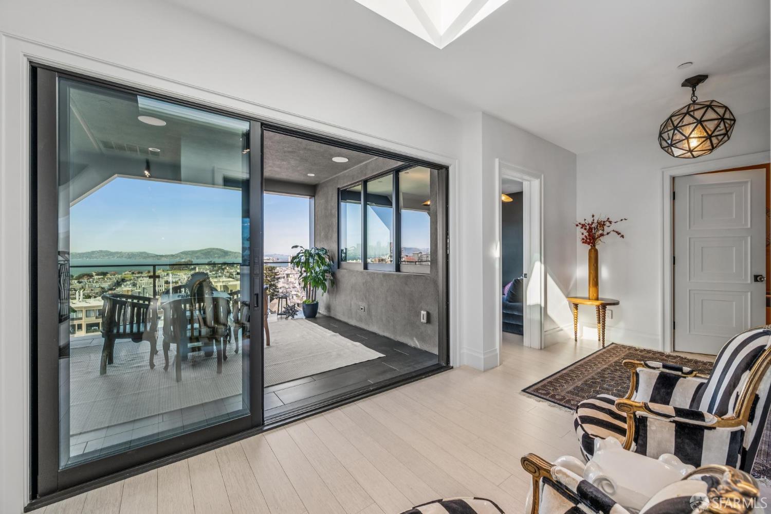 Perched on a coveted flat block inPacific Heights, this grand-scale Victorian, built in 1887 by renowned architect Charles Kenitzer, has been transformed through a meticulous five-year rebuild, marrying historic detail with modern sophistication. Spanning approximately 8,485 square feet, this 6-bedroom, 6-full-bath, 2-powder-room residence offers an extraordinary blend of timeless craftsmanship and contemporary design, complete with an elevator servicing the ground floor through the top four levels and dramatic Bay views from nearly every level. The property includes 4-car parking: a 3-car garage plus gated driveway space. Enter through original double doors into a grand parlor with soaring 13-foot ceilings, wide-plank oak floors, and a sweeping staircase. The gourmet kitchen and great room are anchored by a 9-burner Lacanche range, mahogany cabinetry, three dishwashers, and custom copper fixtures, opening to a terrace with panoramic views and a fully equipped outdoor kitchen. The primary suite offers stunning views, a fireplace, a custom dressing room, and a spa-like bath with a hammered copper tub and steam shower. Additional bedrooms feature charming details, built-ins, and direct views of city landmarks like theTransamerica Pyramid. The top floor includes a skylit bedroom, media room, and office with a private view deck. Designed for relaxation and hosting, the lower floors include a lounge with a backlit onyx bar and stage, a 3,000-bottle wine cellar, a home gym, and full spa facilities including a hot tub, sauna, cold plunge, and outdoor shower. This iconic property has also served as the backdrop for private, high-profile events, most recently hosting a Jordan Brand Super Bowl weekend experience, further underscoring its exceptional capacity for entertaining at the highest level. Located steps from Union Street, Fillmore Street, and thePresidio of San Francisco, this exceptional residence offers grand-scale living in one of the city's most sought-after and storied neighborhoods.