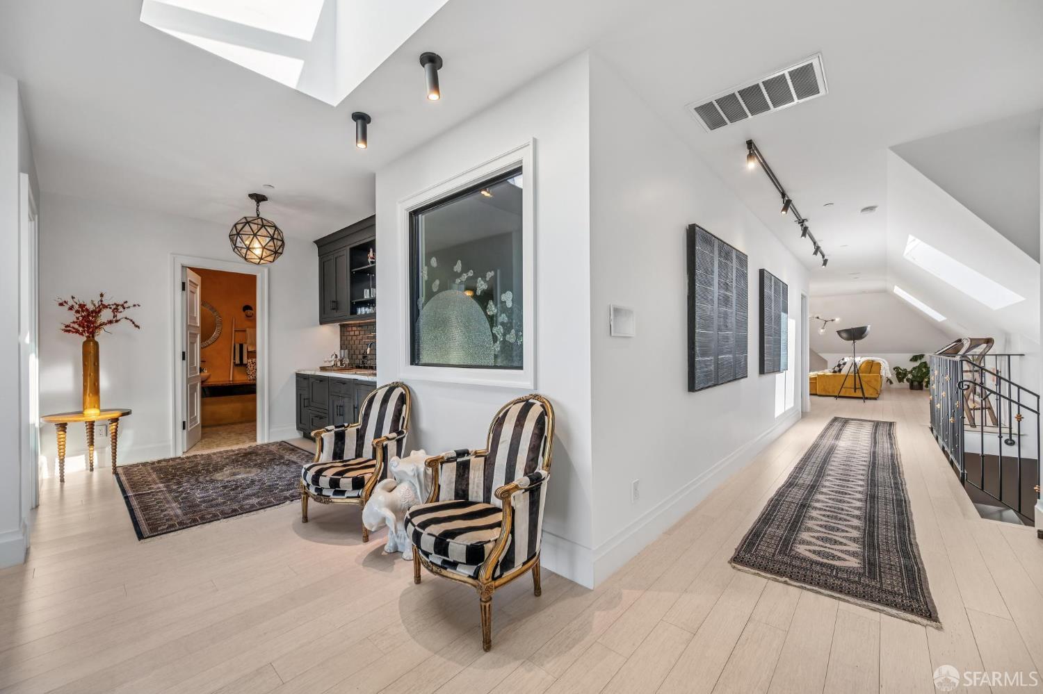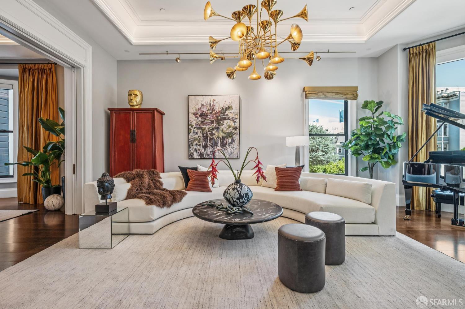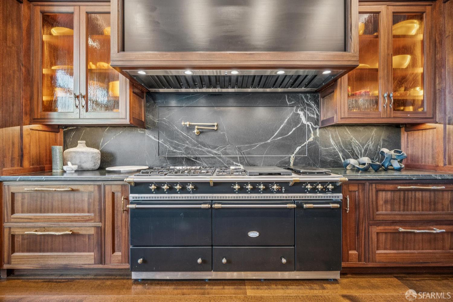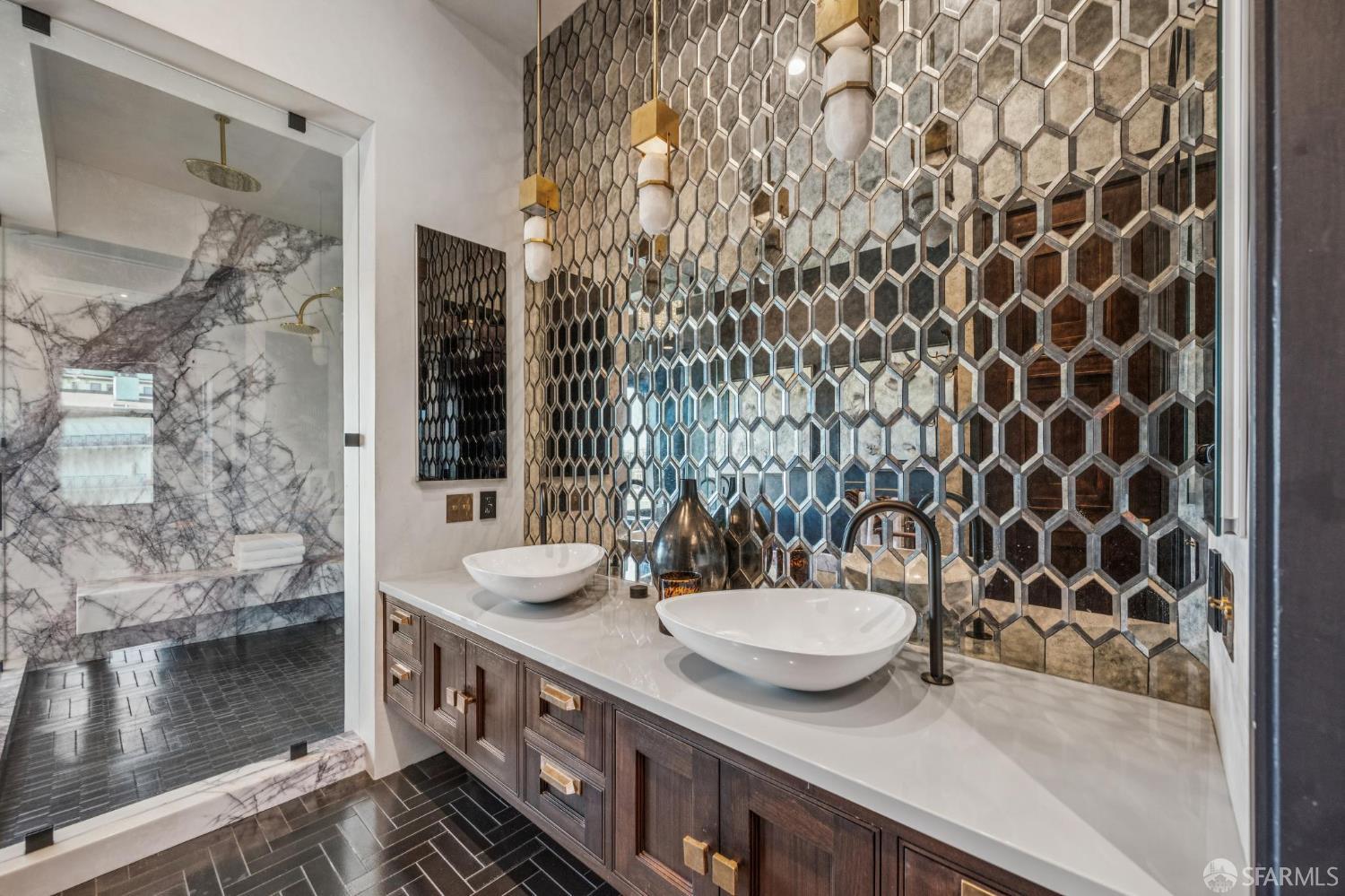 Perched on a coveted flat block inPacific Heights, this grand-scale Victorian, built in 1887 by renowned architect Charles Kenitzer, has been transformed through a meticulous five-year rebuild, marrying historic detail with modern sophistication. Spanning approximately 8,485 square feet, this 6-bedroom, 6-full-bath, 2-powder-room residence offers an extraordinary blend of timeless craftsmanship and contemporary design, complete with an elevator servicing the ground floor through the top four levels and dramatic Bay views from nearly every level. The property includes 4-car parking: a 3-car garage plus gated driveway space. Enter through original double doors into a grand parlor with soaring 13-foot ceilings, wide-plank oak floors, and a sweeping staircase. The gourmet kitchen and great room are anchored by a 9-burner Lacanche range, mahogany cabinetry, three dishwashers, and custom copper fixtures, opening to a terrace with panoramic views and a fully equipped outdoor kitchen. The primary suite offers stunning views, a fireplace, a custom dressing room, and a spa-like bath with a hammered copper tub and steam shower. Additional bedrooms feature charming details, built-ins, and direct views of city landmarks like theTransamerica Pyramid. The top floor includes a skylit bedroom, media room, and office with a private view deck. Designed for relaxation and hosting, the lower floors include a lounge with a backlit onyx bar and stage, a 3,000-bottle wine cellar, a home gym, and full spa facilities including a hot tub, sauna, cold plunge, and outdoor shower. This iconic property has also served as the backdrop for private, high-profile events, most recently hosting a Jordan Brand Super Bowl weekend experience, further underscoring its exceptional capacity for entertaining at the highest level. Located steps from Union Street, Fillmore Street, and thePresidio of San Francisco, this exceptional residence offers grand-scale living in one of the city's most sought-after and storied neighborhoods.